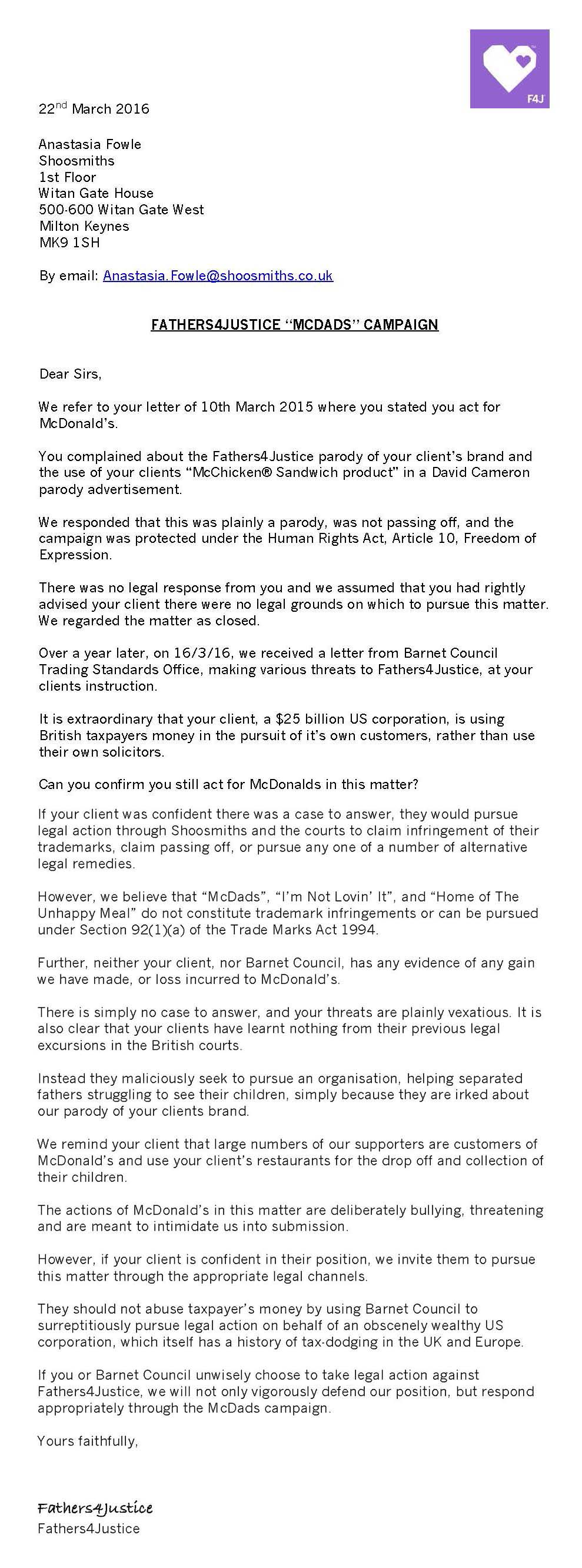 If you or Barnet Council unwisely choose to take legal action against Fathers4Justice, we will not only vigorously defend our position, but respond appropriately through the McDads campaign.